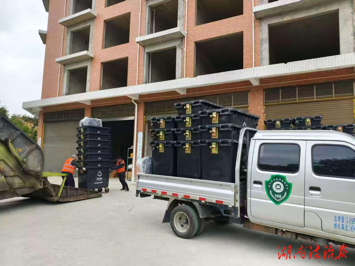 圖為收集站工作人員搬運(yùn)新垃圾桶開展更換工作