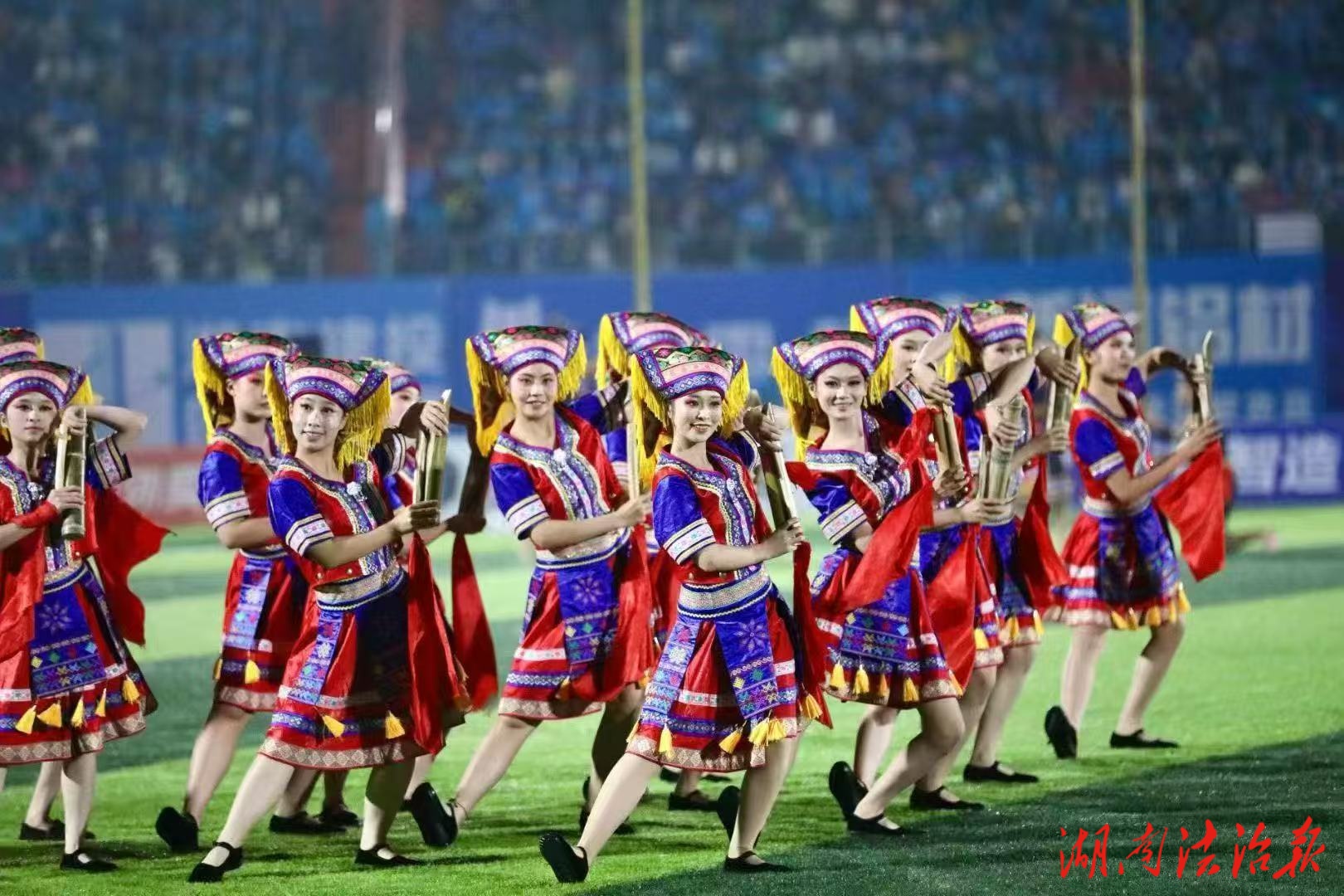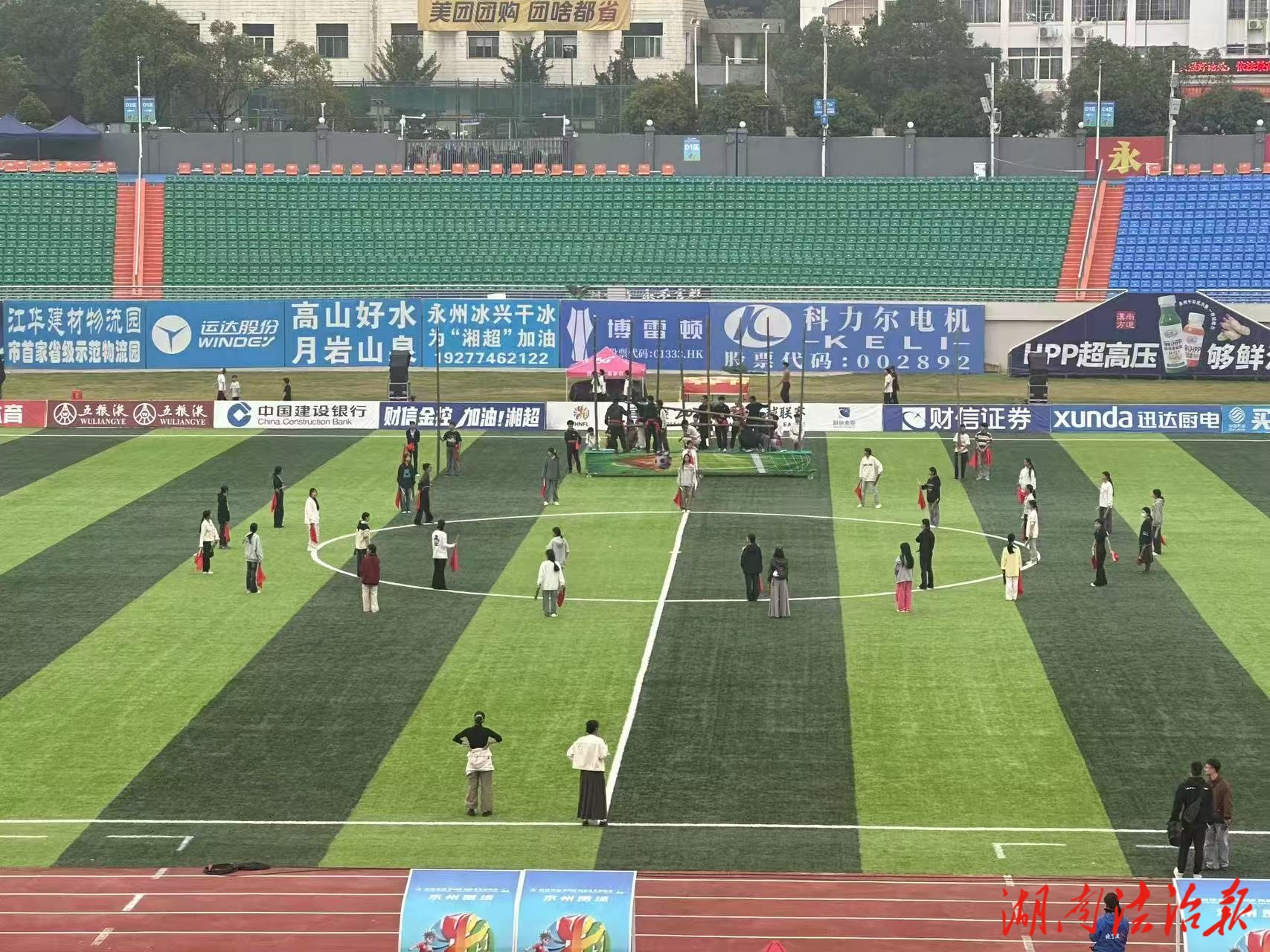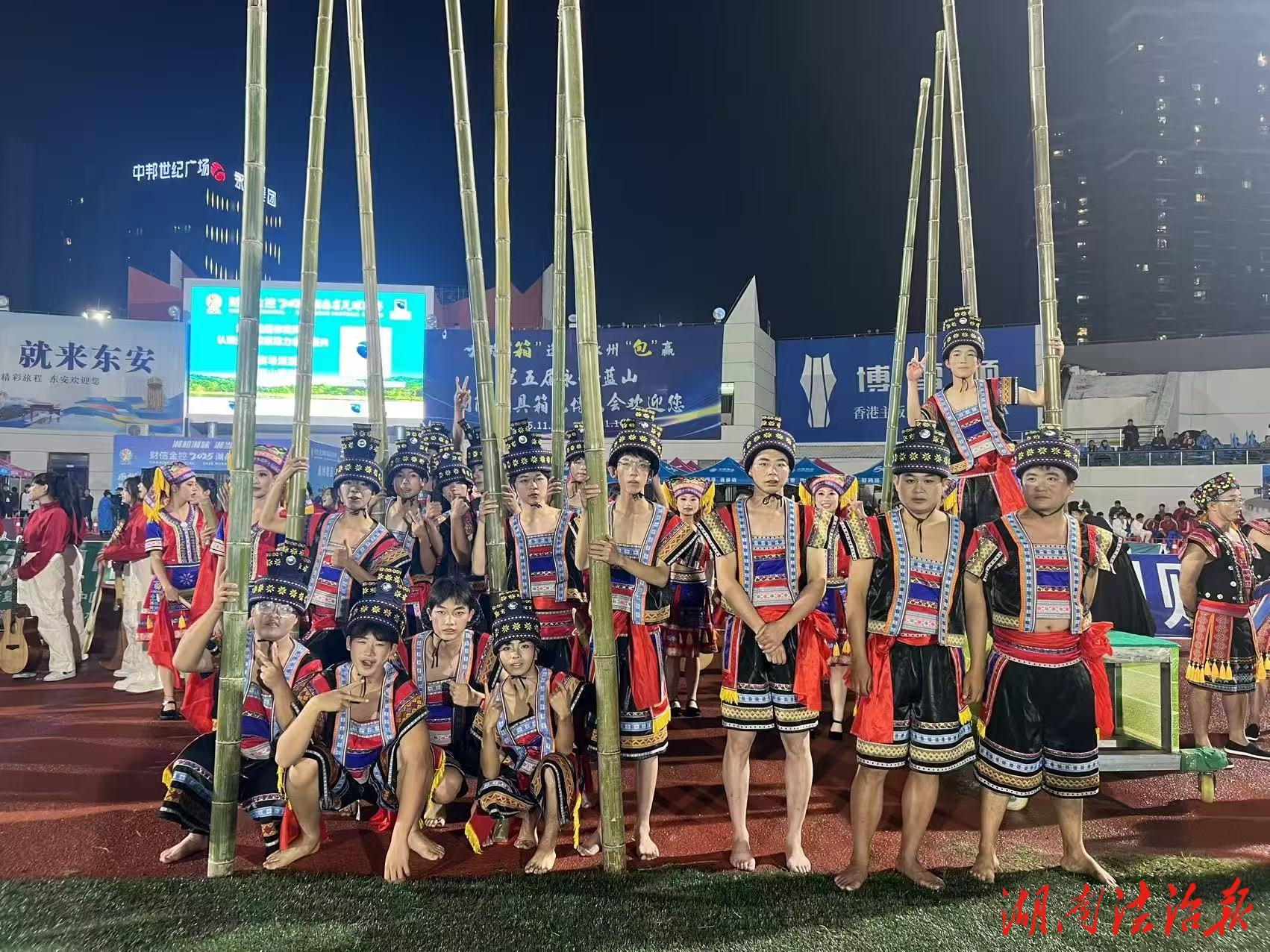 江永縣職業(yè)中專學(xué)校55名學(xué)子用瑤族竹梆敲響湘超賽場(chǎng)