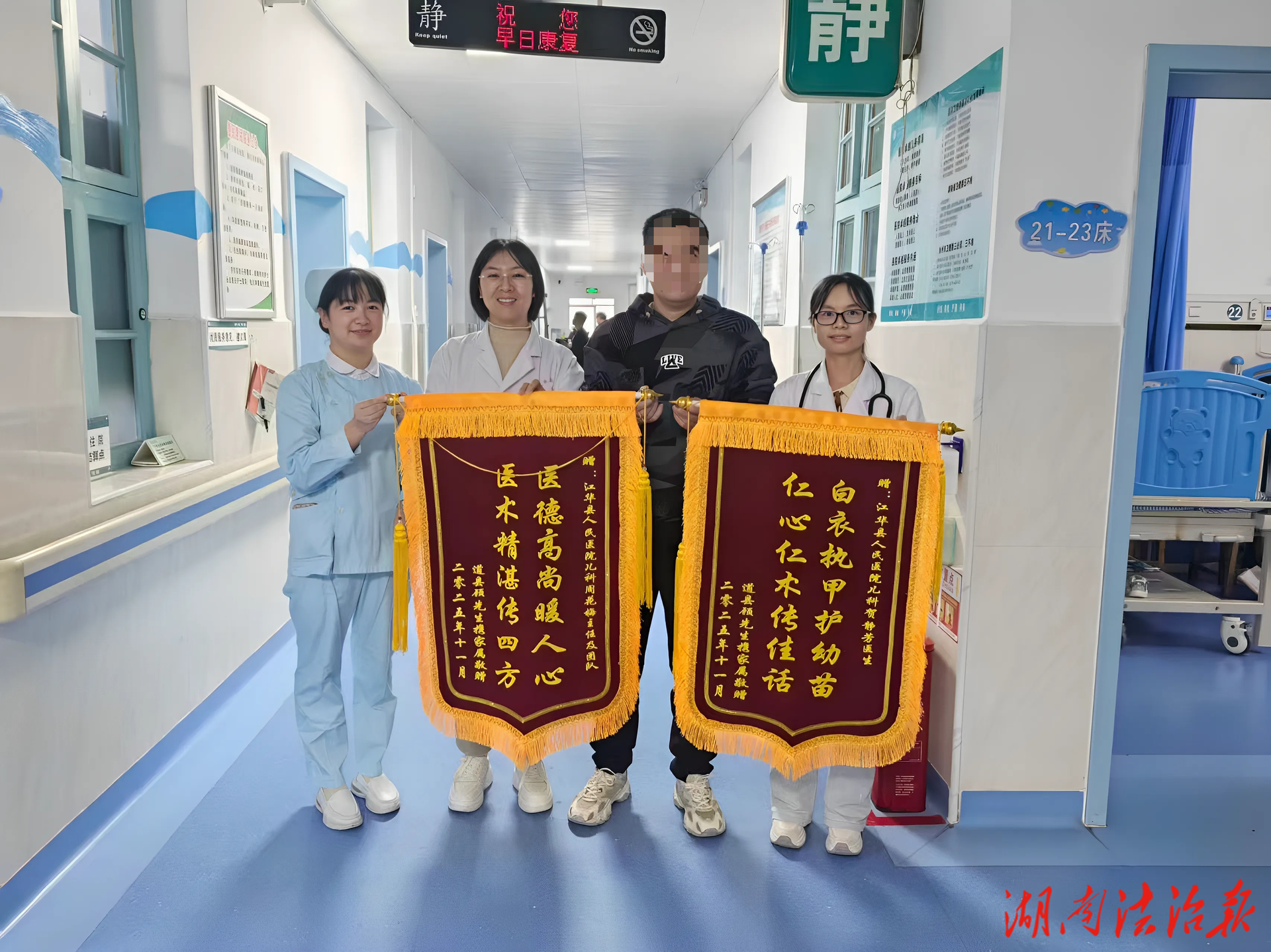 湖南法治報(bào)訊(通訊員 唐桂云)近日,在江華瑤族自治縣人民醫(yī)院兒科,一名康復(fù)出院的川崎病患兒的父親將兩面分別印有“醫(yī)德高尚暖人心,醫(yī)術(shù)精湛傳四方”和“白衣執(zhí)甲護(hù)幼苗,仁心仁術(shù)傳佳話”的錦旗送到了兒科醫(yī)護(hù)團(tuán)隊(duì)手中。